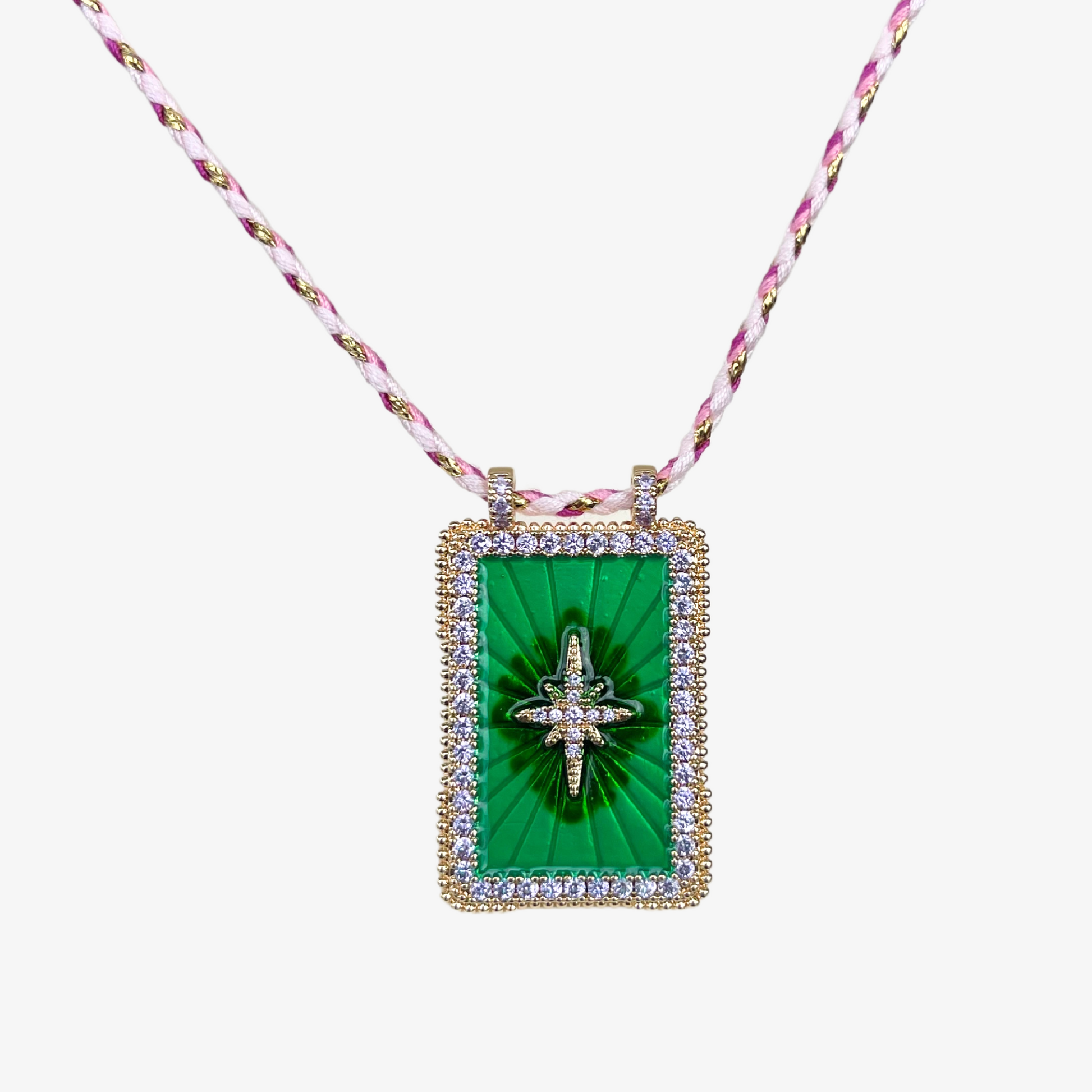 تعتبر هذه القلادة الرائعة الملقبة بـ "النجمة الزمردية" قطعة استثنائية تجمع بين الأناقة والأصالة. قلادتها المستطيلة ذات اللون الأخضر الزمردي مزينة بشكل جميل بنجمة ذهبية في المنتصف، وتحيط بها رصيف رقيق من الأحجار الوردية. تضيف السلسلة المضفرة باللونين الوردي والذهبي لمسة من الرقي والسحر.