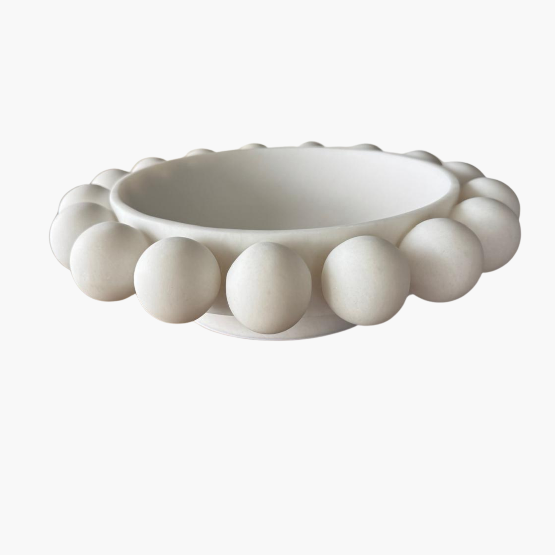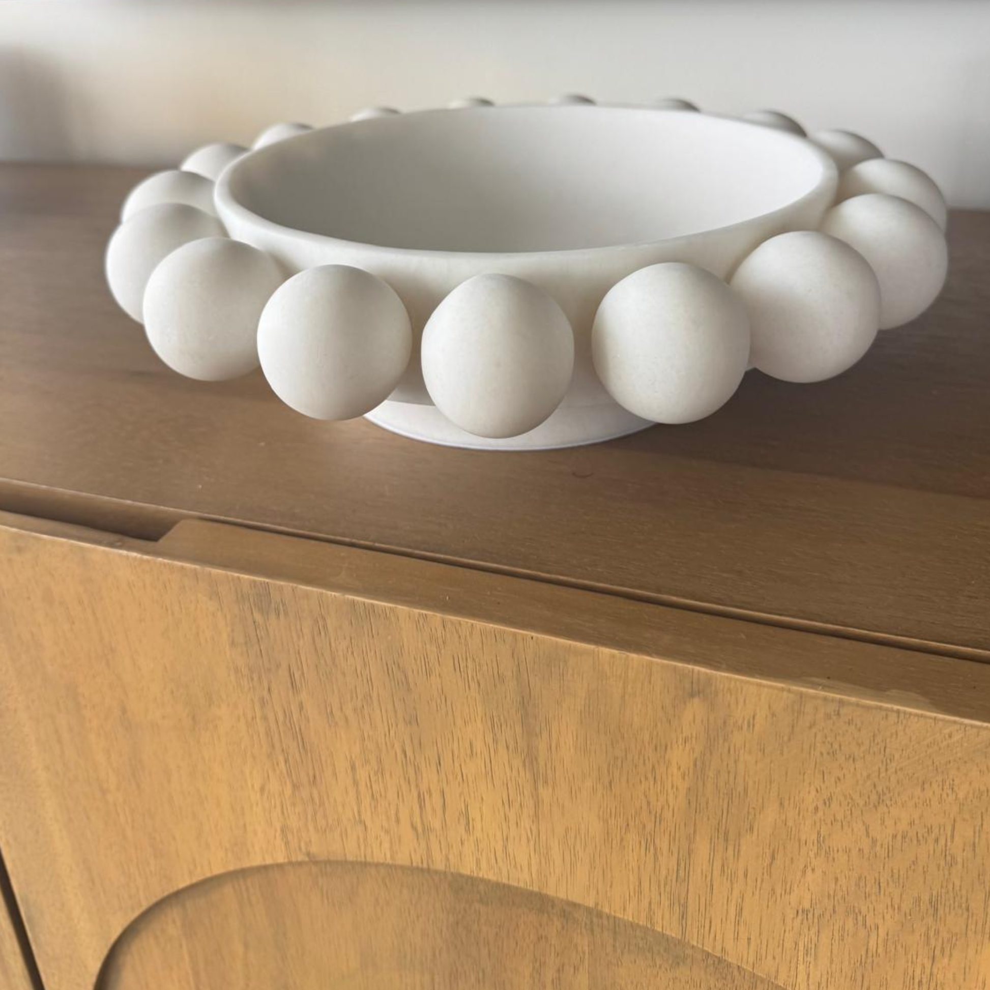 Ce bol décoratif blanc, orné de perles sculpturales tout autour, apporte une touche moderne et élégante à votre intérieur.