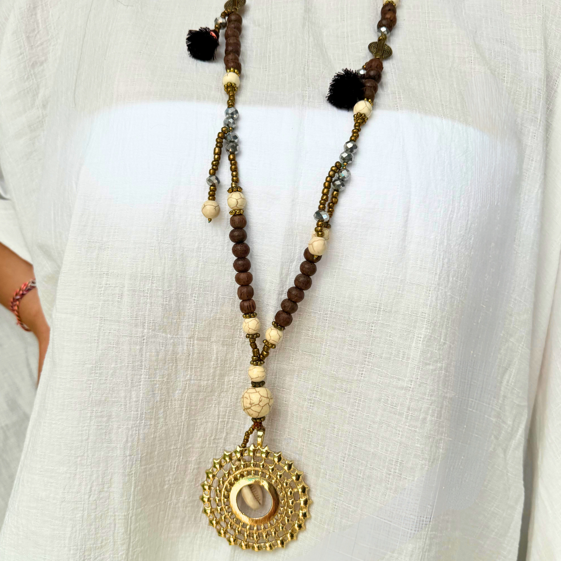 Ce collier ethnique incarne l'élégance naturelle à travers une combinaison harmonieuse de perles en bois, de pierres naturelles et de touches dorées. Le pendentif circulaire, Chaque détail de ce collier est soigneusement conçu pour offrir une qualité exceptionnelle et un style intemporel.