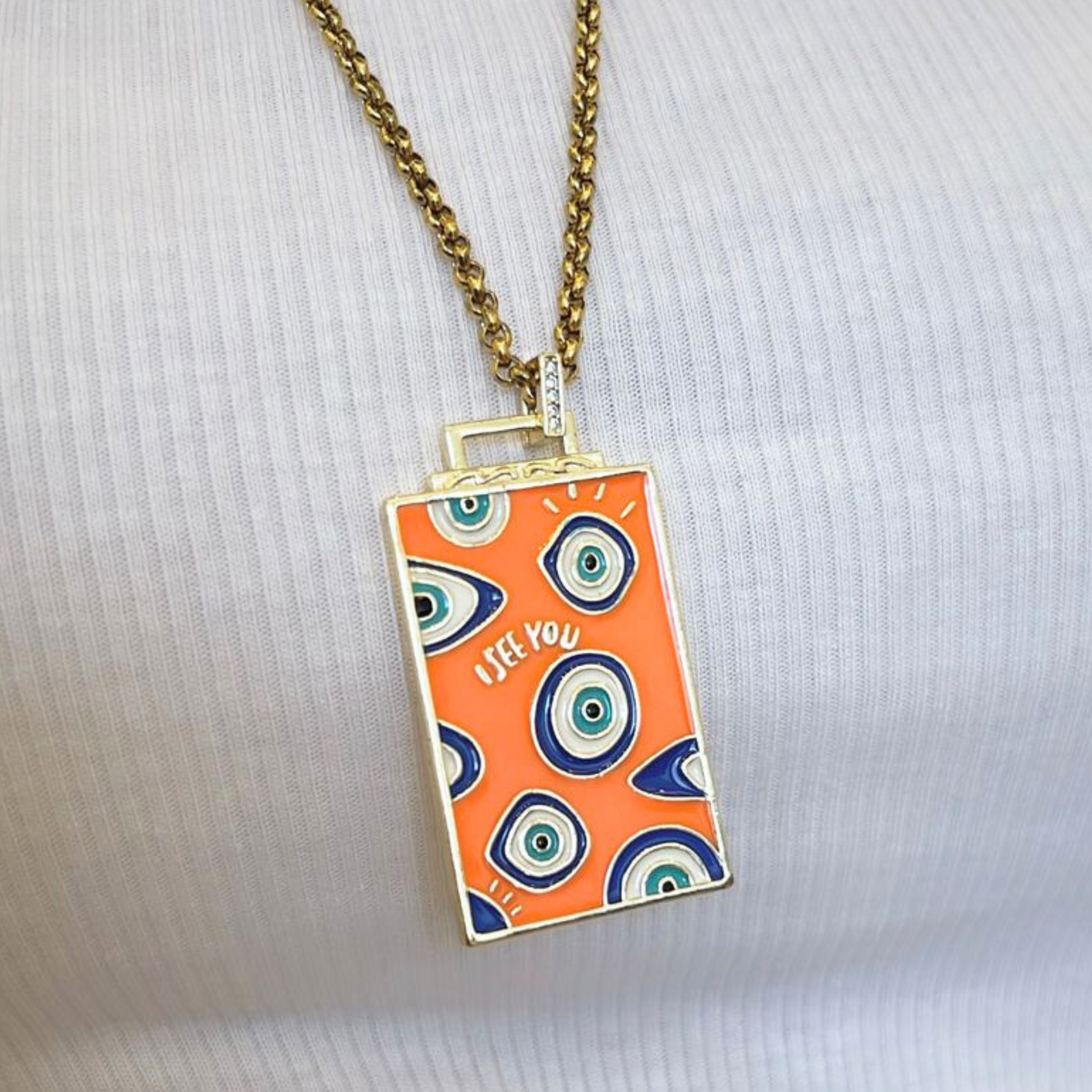 Affirmez votre style avec ce collier audacieux et vibrant, mettant en avant un grand pendentif rectangulaire en émail coloré. L'illustration unique d'yeux porte-bonheur, sur un fond orange vif, est accentuée par l'inscription "I See You" pour un look moderne et mystérieux. La chaîne dorée en maillons épais complète parfaitement ce bijou d'exception, faisant de ce collier une pièce centrale de toute tenue.