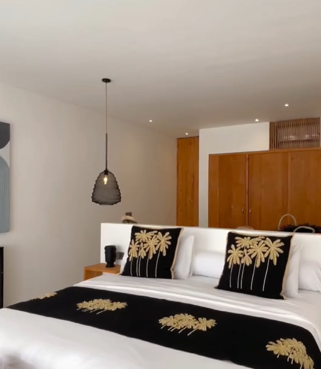 Ce coussin décoratif allie l'élégance du lin naturel à la sophistication du coton noir, mettant en valeur un magnifique motif de palmiers dorés brodés. Inspiré par la beauté tropicale de Bali, ce coussin apporte une touche d'exotisme et de raffinement à votre intérieur. Le contraste entre le fond noir et les broderies dorées crée un effet visuel saisissant, parfait pour rehausser la décoration de votre salon, chambre ou espace de détente.